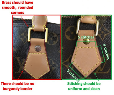 Whether you are generally shopping or for a special occasion like Valentine’s Day you can mostly likely spot a counterfeit item. However, counterfeiters have step up their “game”, but there are still signs you can look out for. One thing to look for besides the spelling I would say is to check the details (see image below for example). It can be something as simple as a signature thread color to how the letters in the symbols intersect. Happy Shopping!