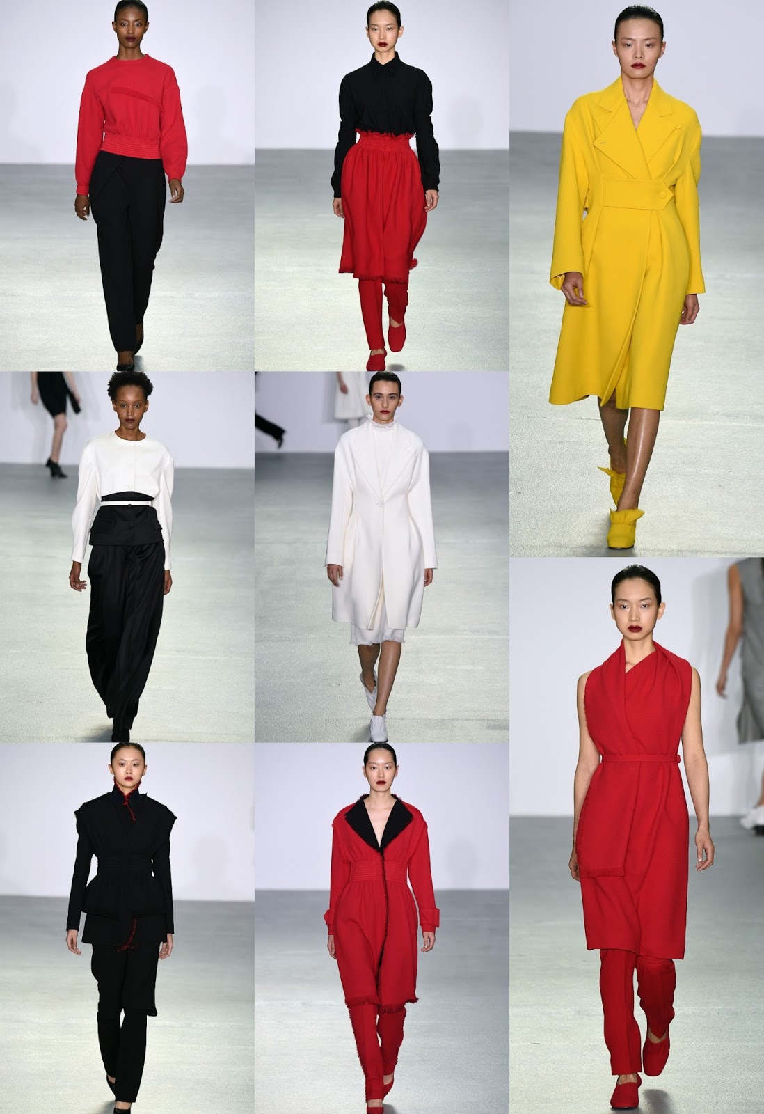 This collection has an overall minimalistic feel with hints of metal. Our favorite pieces would have to red wool trench coats and the cream oversized coat.