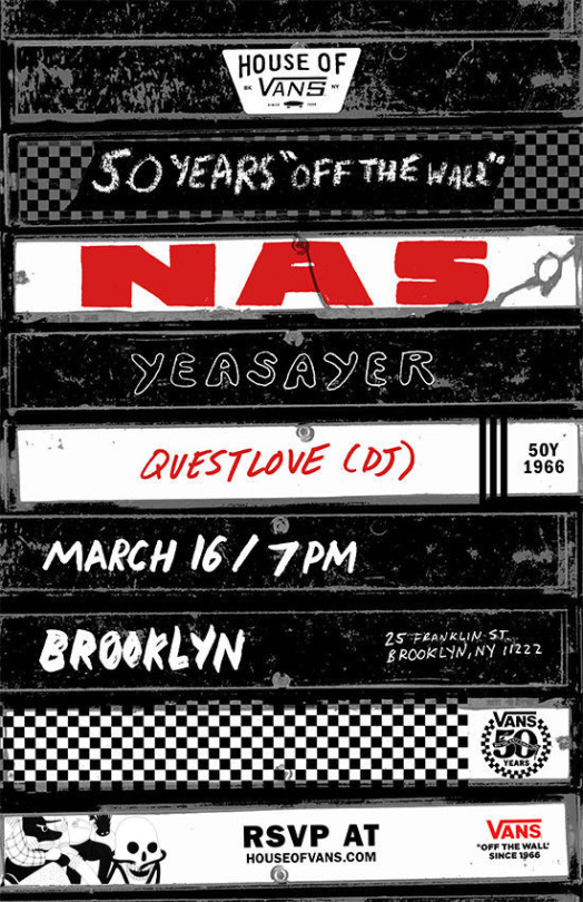 Today marks the 50th anniversary of the skater –inspired shoe and casualwear brand. In honor to celebrate they are having an event called “Off the Wall” taking place at House of Vans in Brooklyn, House of Vans at the Mohawk at SXSW in Austin, and House of Vans in Toronto, Canada.   According to their website the event includes sports, art, music and street culture with a worldwide celebration of creative expression.  Performers include Nas, Dinosaur Jr., Wu-Tang Clan, The Kills, Erykah Badu, Jamie xx, Dizzee Rascal, Yeasayer, and Shlohmo.