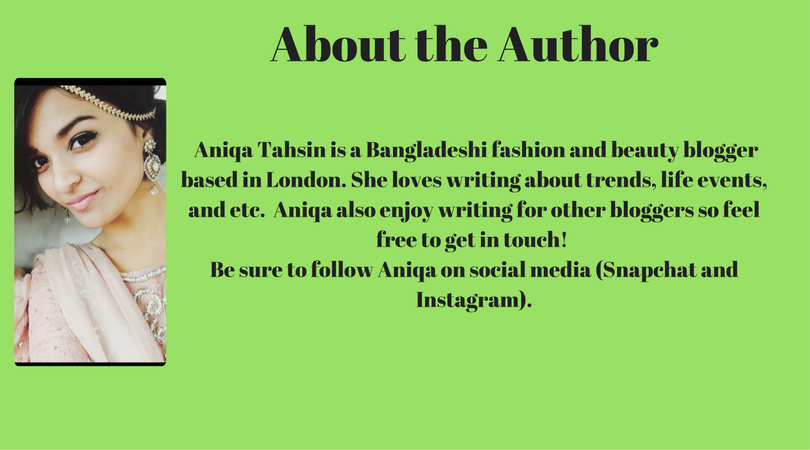 Aniqa Tahsin is a Bangladeshi fashion and beauty blogger based in London. She loves writing about trends, life events, and anything which I think you guys would be into, as well as me. Aniqa also enjoy writing for other bloggers so feel free to get in touch! Be sure to follow Aniqa on social media (Snapchat and Instagram).